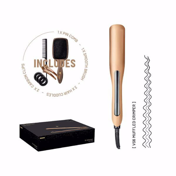 HH Simonsen VS6 Crimping Iron Gold er en limited edition af HH Simonsens skønne ROD VS6 Crimping Iron. Dette crepejern er skabt med gulddetaljer, som giver et flot og eksklusivt design. Udover jernet indeholder denne edition også en børste med vildsvinehår, en spidskam, 3 spiralelastikker, 2 klemmer samt en opbevaringspose.